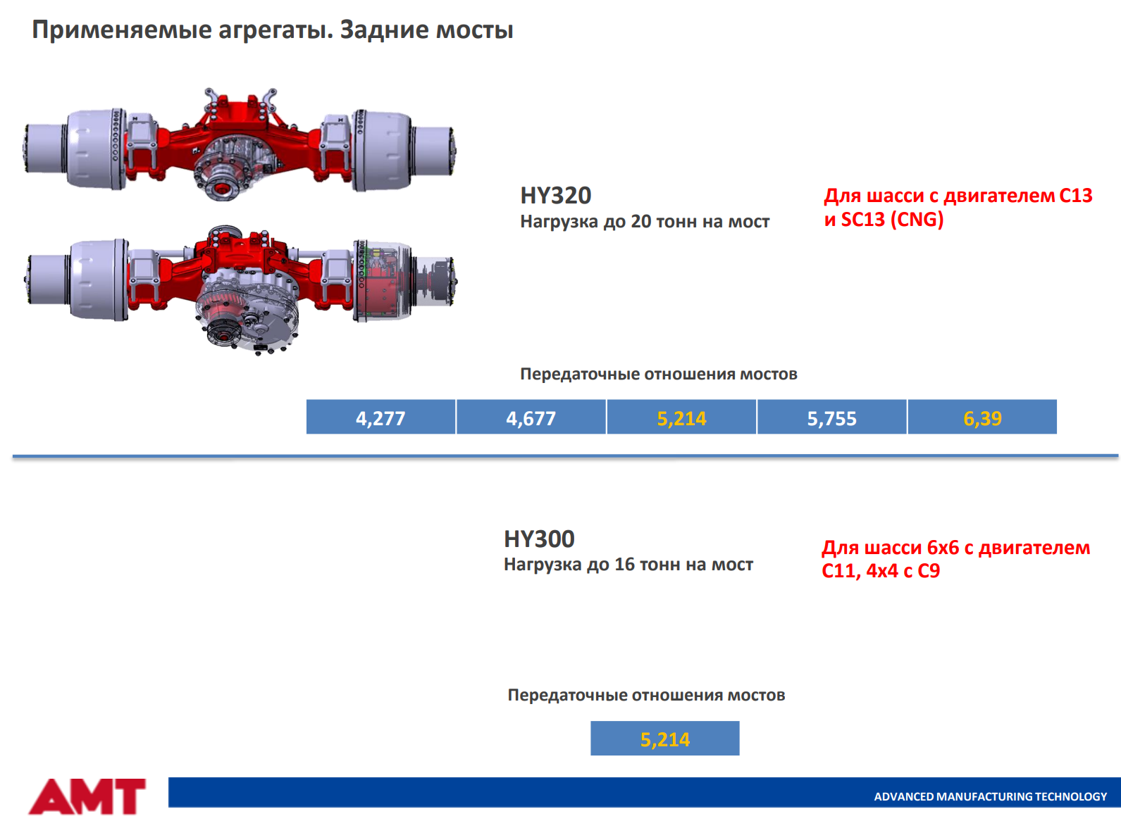 - Задние мосты: HY320 (нагрузка до 20 т на мост) для тяжелых серий и HY300 (до 16 т) для среднетоннажных автомобилей.