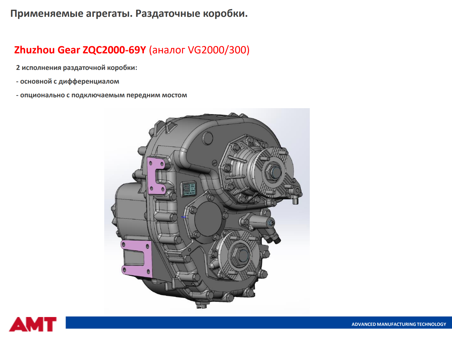 Привод на все колеса обеспечивают надежные раздаточные коробки Zhuzhou Gear (аналоги ZF): ZQC2000 для большинства моделей и более мощная ZTC282 для шасси с двигателем 560 л.с.