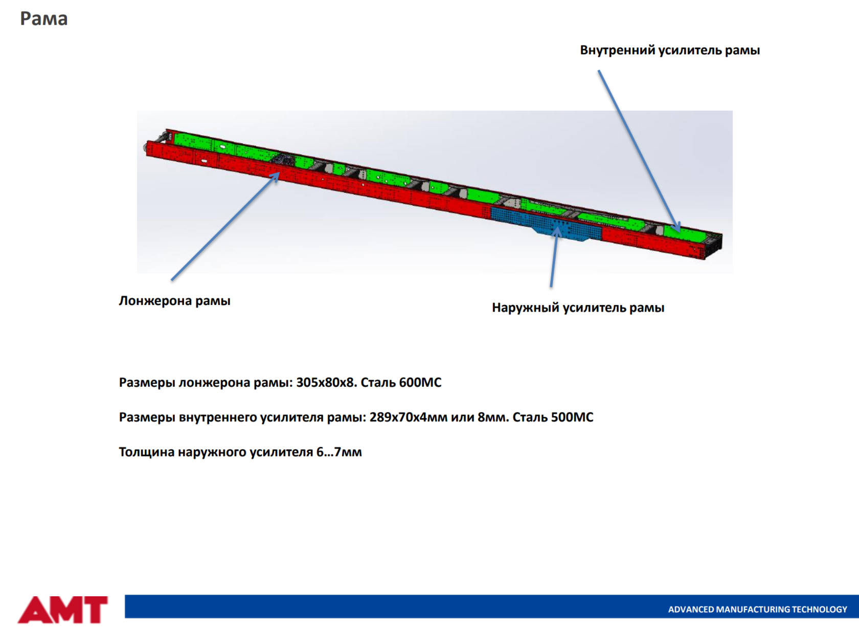 Основой прочности шасси является мощная лонжеронная рама. Лонжероны из высокопрочной стали 600МС сечением 305х80х8 мм усилены внутренними (толщиной 4 или 8 мм) и наружными (6-7 мм) усилителями из стали 500МС, что гарантирует высочайшую стойкость к кручению и изгибу при полной нагрузке.