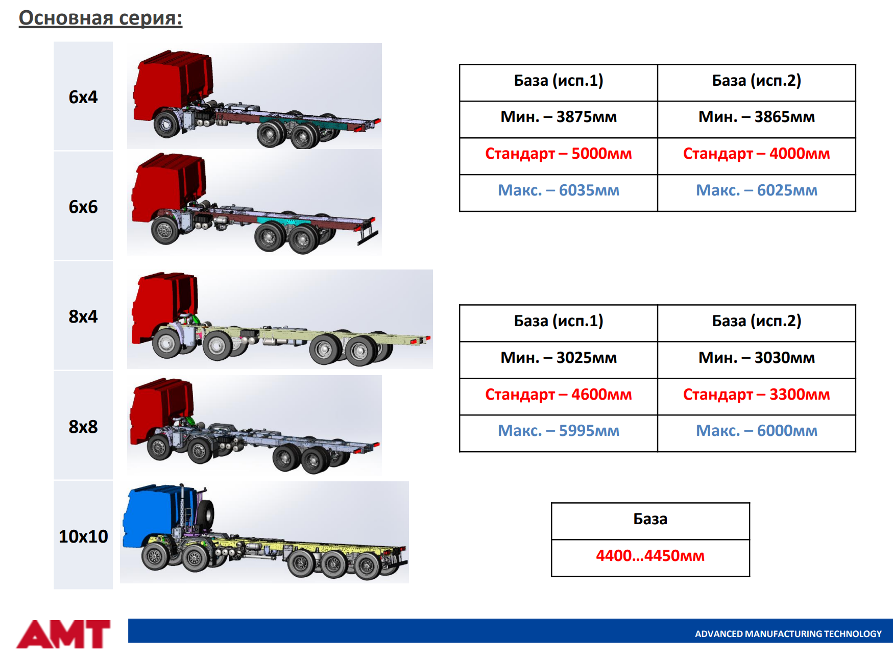 Шасси AMT предлагаются в широкой гамме колесных формул, покрывающих практически все возможные потребности: от классических 6x4 и 8x4 до мощных многоосных исполнений 6x6, 8x8 и 10x10, предназначенных для перевозки особо тяжелых и крупногабаритных грузов.