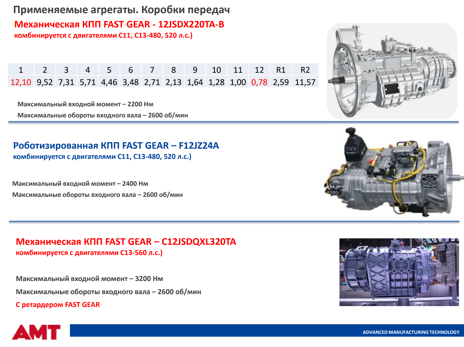 В паре с двигателями работают механические и роботизированные коробки передач Fast Gear, подобранные под конкретный крутящий момент мотора: 12JSDX220TA-B (2200 Нм), роботизированная F12JZ24A (2400 Нм) и усиленная C12JSDQXL320TA (3200 Нм) для топовой версии на 560 л.с.