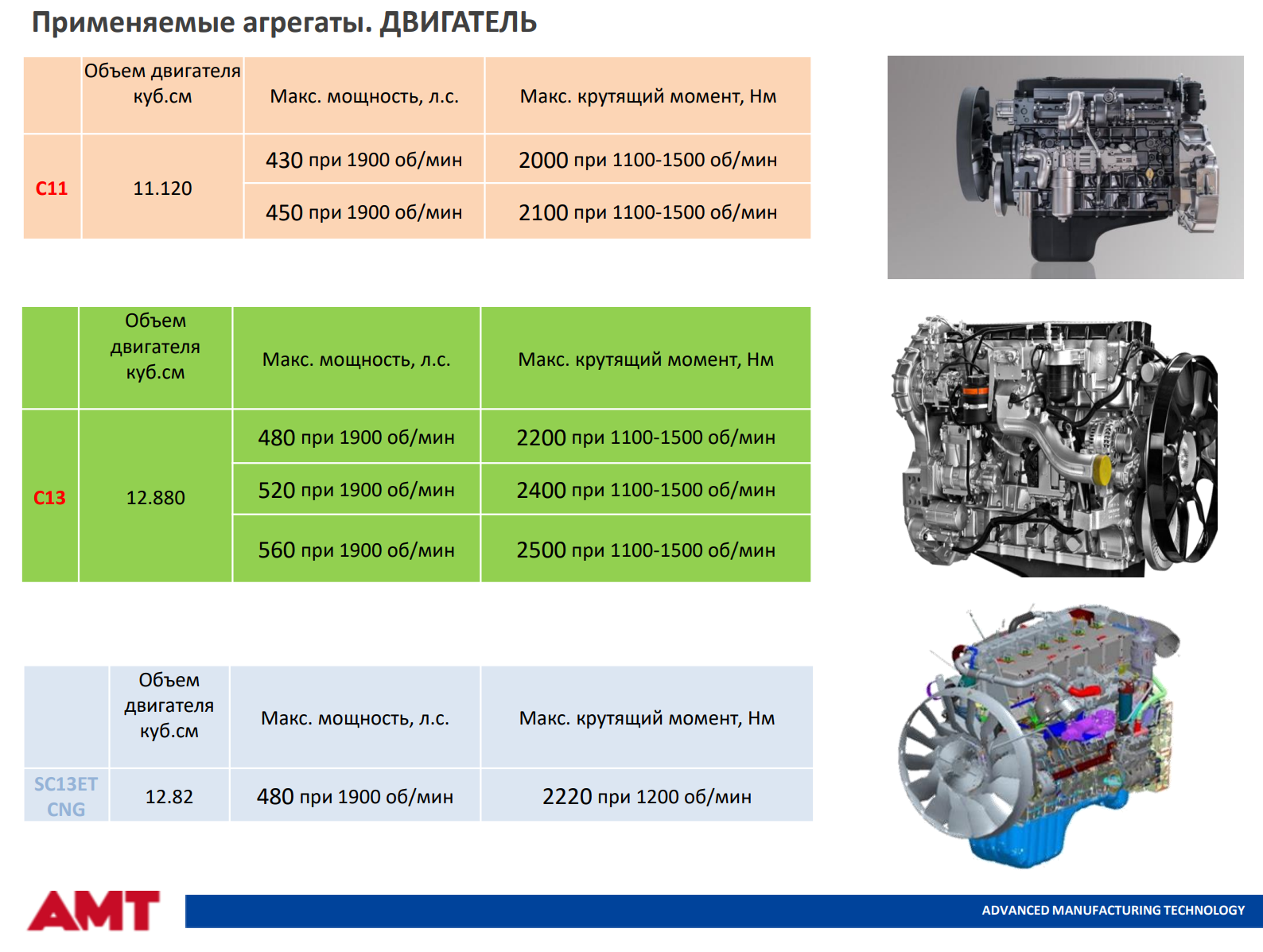 Шасси AMT комплектуются современными дизельными двигателями CURSOR серий C11 и C13, а также газомоторным двигателем SC13ET CNG.