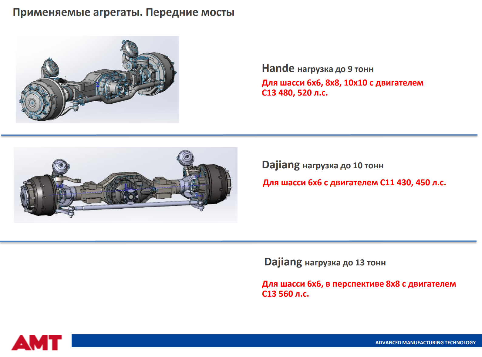 - Передние мосты: Handle (до 9 т), Dajiang (до 10 т и 13 т).
