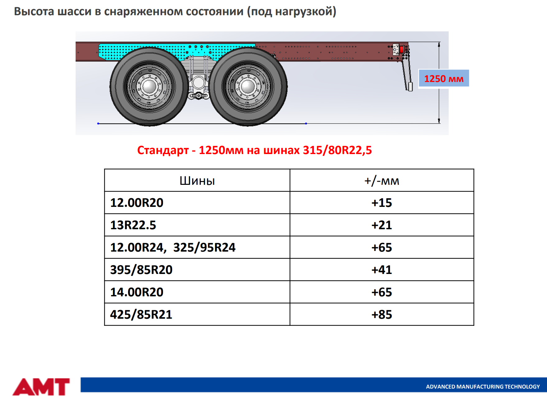Важным преимуществом является низкая высота шасси в снаряженном состоянии — стандартные 1250 мм на шинах 315/80R22,5. Это существенно облегчает монтаж надстроек и позволяет добиться оптимального центра тяжести готового автомобиля. Предусмотрена возможность установки шин различного типоразмера (от 12.00R20 до 425/85R21) с четкой калькуляцией изменения высоты платформы.